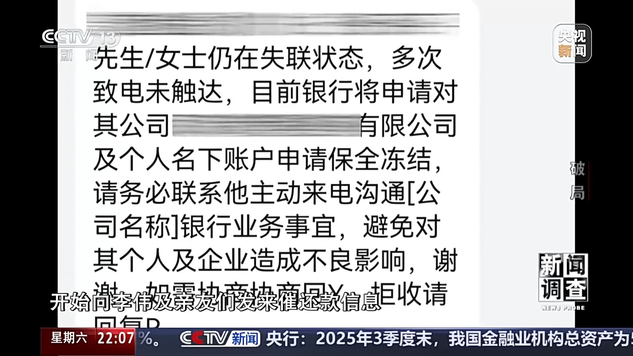 重组工作还没有任何进展,李伟的贷款已经开始逾期,正是一家找不到的互联网金融机构,以短信、电话等方式,开始向李伟及亲友们发来催还款信息。